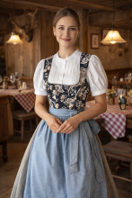 Dieses Dirndl ist ein sommerlicher Blickfang! Die feine Baumwoll-Qualität mit dem floralen Druck zieht alle Blicke auf sich. Der herzförmige Ausschnitt ist mit einer Paspel farblich abgesetzt. Der Rock ist in Falten gelegt und erhält dadurch seine schwingende Weite. Die einfarbige Schürze mit dem kontrastfarbigen Schürzenband sind perfekt auf den floralen Druck abgestimmt und runden den malerischen Look makellos ab. In den Rock ist rechts eine Eingriffstasche eingearbeitet und als Verschluss dient ein Knopfverschluss mit hochwertigen Knöpfen in der vorderen Mitte.