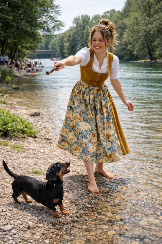 Top: lightweight cotton corduroy with buttons; skirt: beautiful high-quality cotton; apron: silk in gold/bronze, sky blue silk, or beautiful cotton batiste.